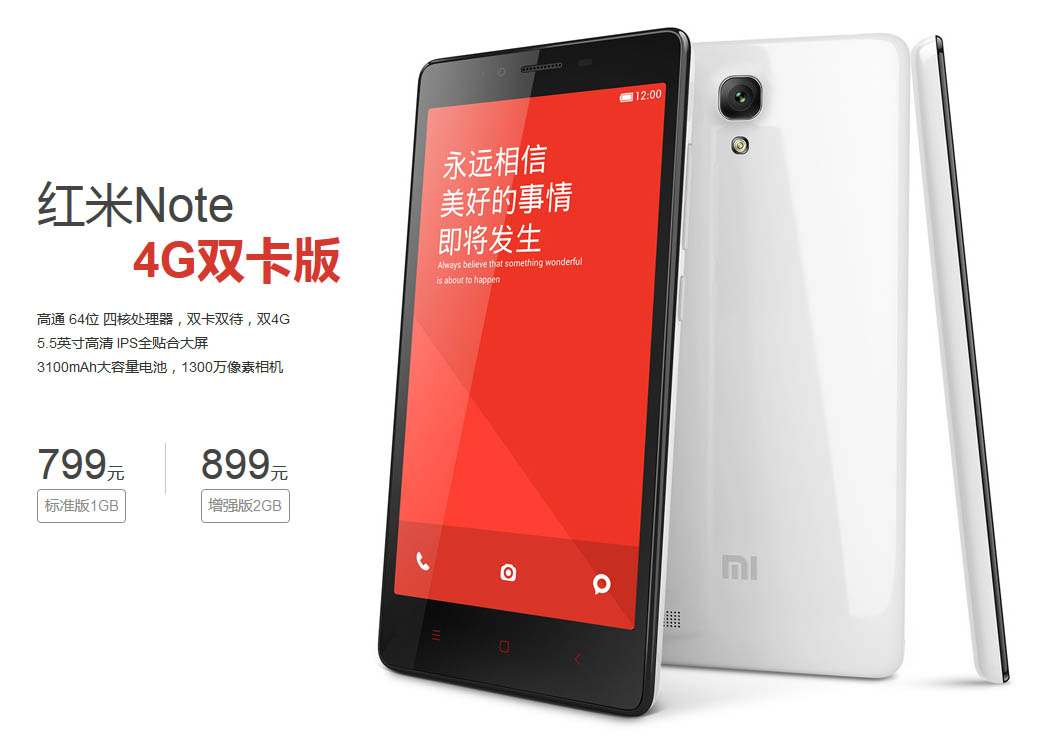 根据工信部入网信息显示,小米公司的新款红米Note移动版与联通版日前获得入网许可,从参数上看,新机与已经在售的红米Note基本一致,依然是5.5吋屏幕,3100mAh电池,新加入了双卡双待支持。预测会在处理器方面跟红米Note电信版一齐升级为骁龙410,继续卖899块吧。