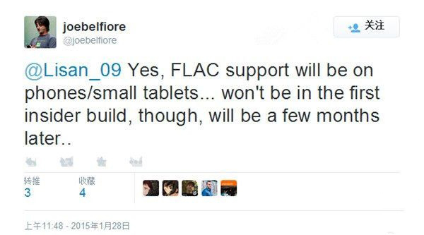 Joe Belfiore 在推文中确认:“没错!Windows 10 手机/小型平板设备将会支持 FLAC 格式,不过它不会出现在首个 Insider 预览版中,预计到几个月后才会出现...”