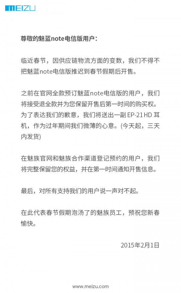 对于那些想要买魅蓝Note电信版的用户来说,不好的消息来了。昨天晚些时候,魅族在其官方微博上宣布,魅蓝Note电信版将推迟开卖,而首批全款预订的用户可以选择退款,同时魅族也会免费发给这些用户一副EP-21HD耳机作为补偿。至于开卖的时间,魅族并没有宣布。