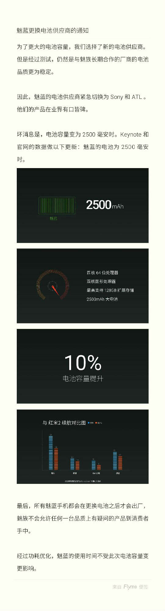 最后魅族还强调,虽然魅蓝手机的电池容量发生了变化,但经过功耗的优化,其使用时间不会发生变化。