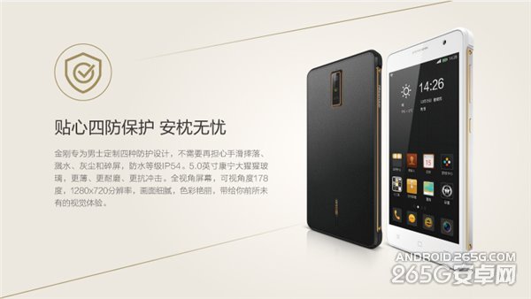 外观方面,海信金刚机身尺寸为144x71.9x9.4mm,重146g;手机后盖采用皮革纹理,侧边特别设计四颗CD纹螺钉作为装饰,整体看上去颇具英伦风范。另外,海信金刚四角采用双色注塑硅胶设计,可帮助缓冲实现防摔功能;同时,金刚手机有效防尘、防水,防水等级为IP54。