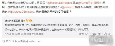 不过,关于前面的爆料,微博网友也提出了自己关心的问题,且大部分的问题都是关于新一代iPhone的摄像头,如“确定摄像头网传的没可信度?”“摄像 头至少升级到定制版的240吧。”等。对于这些问题,得到的回答则是“屏幕没什么变化,摄像头还有确定的消息”。因此,iPhone6s的摄像头是否与 iPhone6一样凸起,还是个未知数。