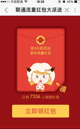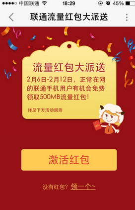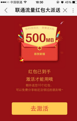 现在联通开展了“流量红包大派送”活动,通过官方APP“手机营业厅”扫描二维码即可领取500MB流量,该红包是春节流量专用红包,一个手机号码只能领取一个红包,仅限2015年2月内使用。