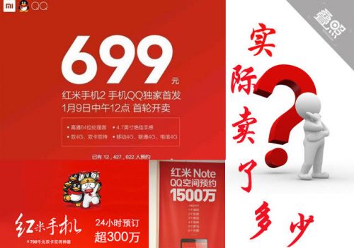 尽管小米常常被质疑人为用开抢后马上换上告罄页面的方式炒作,但小米官方依然坚持公布让外界吃惊的预订量。去年3月,红米Note曾创造出34分钟售出10万部的成绩;去年5月,小米官方表示已有1500万人预订了红米Note。今年1月刚推出的红米2在预售两天后预约量是1240万人次。不过由于是免费预约的,无需交付定金,实际购买的人数我们无法知晓。