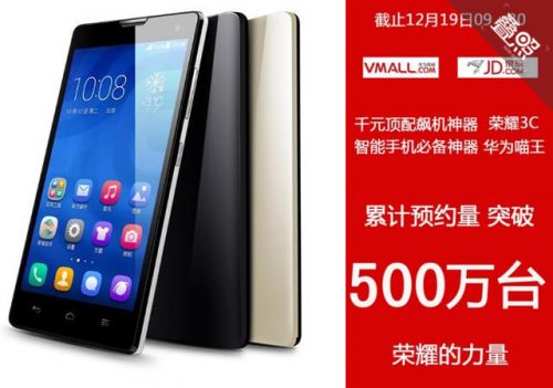 售价798元的华为荣耀3C正式发布后,同样迅速受到广大用户的热烈追捧。2013年12月19日,华为官方在官方微博上高调宣布,开始两天华为荣耀3C累计预订量已突破了500万台。2014年12月发布的华为荣耀6Plus 预订量虽然还未知,但就之前荣耀3C的量来看,华为荣耀6Plus的预订量应该也不在少数。