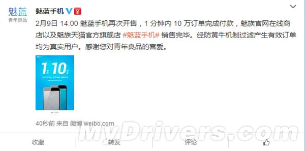 魅族刚刚通过官方微博表示,今天下午2点开售的10万台魅蓝手机已经全部售罄且完成付款。和上次一样,经过防黄牛机制过滤之后的订单均为真实有效用户。