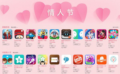 在这个情人节应用专区里,又分为几个版块,分别是甜蜜游戏,欢度情人节,找到完美礼物,爱在时时刻刻,为心上人下厨。应用的种类涉及游戏,生活,社交,音乐,娱乐,摄影与录像,教育,美食佳饮等。