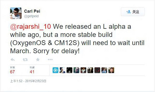 之前有消息称,一加将在二月份就进行Android 5.0系统更新,不过最终还是延期了,Carl Pei也在推特上向用户表示了歉意,但未说明具体原因。