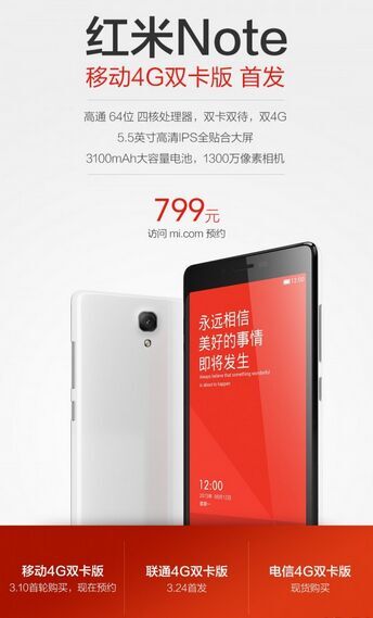 红米Note手机之前曾经推出4G网络版本,不过可惜的是只有单卡设计,最近,针对双卡用户推出了新版红米Note(移动4G双卡版),并且已经在小米官网开启预约了,售价为799元人民币。