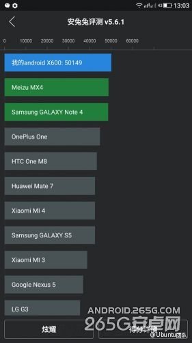 根据之前的消息,乐视将于本月底正式发布超级手机,而且据传有多款。微博用户@Ubuntu团队刚刚放出了一张X600新机的安兔兔(版本v5.6.1)跑分截图,得分高达50149,已经超过了之前的“跑分小王子”魅族MX4,但领先幅度不大。
