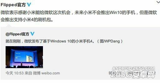 另外小米公司官方微博的说法也认证了小米4能够刷Win10手机版系统。