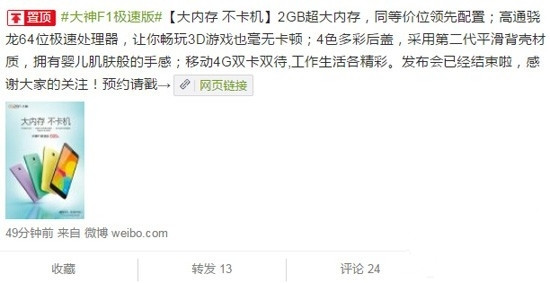 昨天下午,酷派官方微博账号@大神手机发布消息,大神F1极速版手机昨日正式发布,售价699元目前已经在酷派官网开启预约。截至到昨天下午5点多,已经有将近1000万人次预约了。