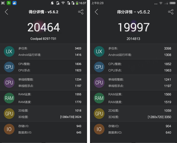 从安兔兔跑分来看,我们不难发现大神F1极速版安兔兔跑分成绩为20464分,而红米2跑分成绩为19997分,大神F1极速版与红米2的分值比较接近。如下图所示。