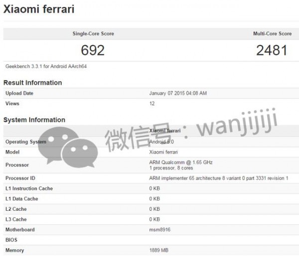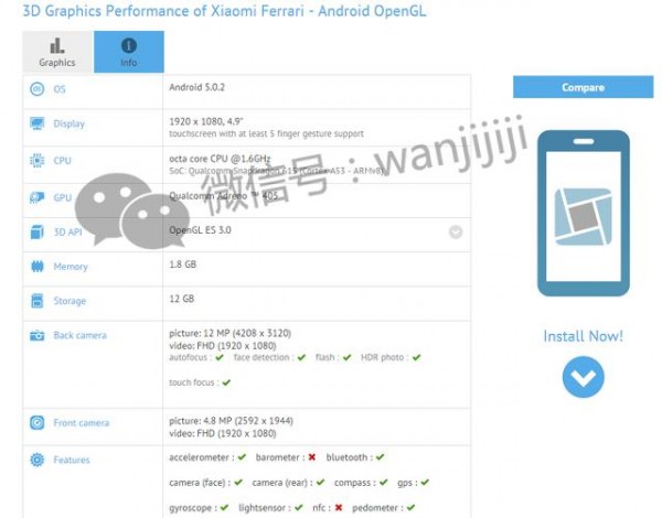 从GFXBench数据库中可以看到,Xiaomi Ferrari采用了1920x1080分辨率显示屏,处理器方面采用了高通骁龙615八核A53,频率为1.65GHz,内置Adreno 405图形处理器,2GB RAM+16GB ROM的存储组合,采用前置500万像素+后置1300万像素摄像头组合,运行Android 5.0.2系统。