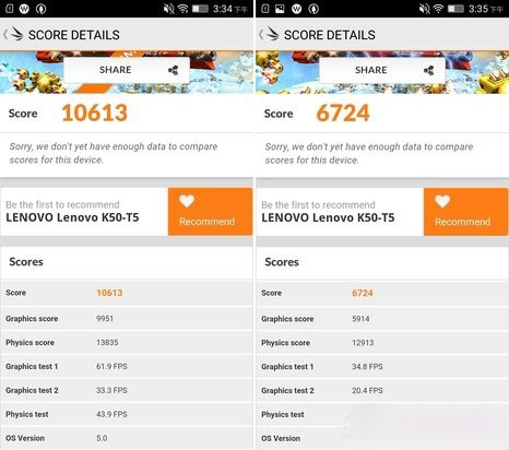 第一项测试时最常见的安兔兔评测,联想乐檬K3 Note表现很惊人,单看45419分的得分已经超越了很多2014年旗舰产品,它比起骁龙801完全不逊色,但是通过细化的分数对比可以发现,在GPU方面的得分还是MT6752的硬伤,毕竟这是其定位所限,只使用了Mali-T760 MP2,它在平常使用时无压力,不过在这种火力全开的场景下,还是略显稚嫩。