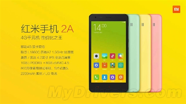 红米2A,即廉价版红米,4.7寸IPS屏幕(720p),移动4G,双卡双待,联芯L1860C四核A7 1.5GHz处理器,1GB LPDDR3内存+8GB eMMC 4.5机身存储,800万BSI相机,2200mAh电池。