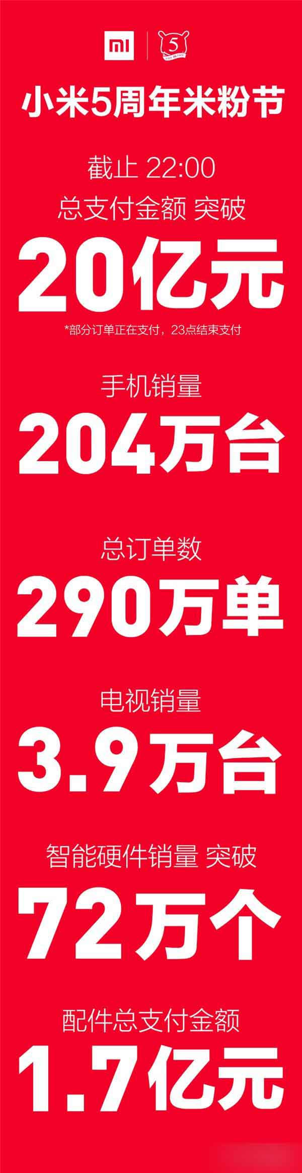 4月9日消息,小米5周年米粉节已于昨晚结束,数据显示,截止到4月8日晚上23:00,米粉节总支付金额超过20.8亿元,售出手机212万台,打破了去年天猫双11平台上189万台的手机出货总量记录。