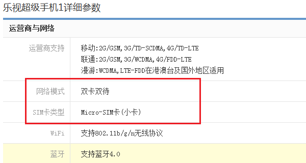 不过在其他第三方平台,我们可以查到乐视超级手机更详细的网络制式信息,从中可以看到,乐视超级手机1是采用双卡设计,支持双卡双待,其采用的是Micro-SIM卡(小卡),如下图所示。