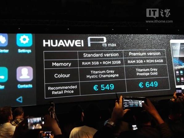 华为P8 max仅有双卡版一款可选,同样采用3GB内存,16GB机身存储以及64GB机身存储版本价格分别为549欧元(约合人民币3613元)、649欧元(约合人民币4272元)。配色分配上,与前面的华为P8完全一致。