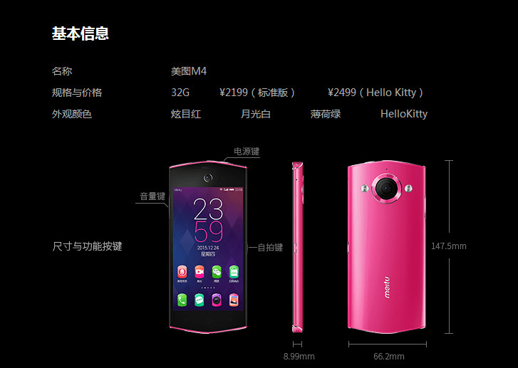 美图手机m4有三个4个款式:标准版炫目红、月光白、薄荷绿、以及Hello Kitty特别版,可以说是专为女孩子们设计的一款自拍神器,连颜色都这么绚丽,价钱也是偏向大众能接受的:标准版2199 、Hello Kitty特别版2499