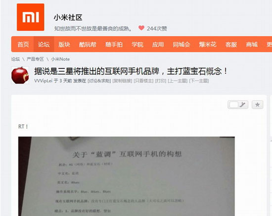 在刚刚过去的这个周末,表面无波的国内手机市场其实并不平静,一条真假难辨的消息在业内流传:三星将推互联网手机子品牌来对抗华为小米,并主打蓝宝石手机概念。事情起源于3天前发布在小米论坛上的一篇帖子,这篇标题为“据说是三星将推出的互联网手机品牌,主打蓝宝石概念!”的帖子,正文只有两个字“RT!”和两张图片,正是这两张拍照角度和光线都不甚清晰的A4纸照片,搅乱了很多人的周末生活。