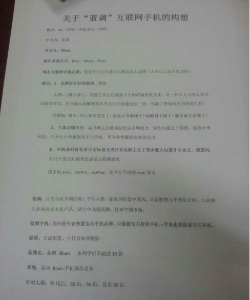 这两张A4纸照片名为《关于“蓝调”互联网手机的构想》(以下简称“构想”),开篇即指明4G和蓝宝石材质是手机行业发展的一大机会,新品牌中文名为“蓝调”,英文名“iBlues”(命名方式和苹果的iPhone十分相似),操作系统则有Blue、iblues、Blues3个作为备选。