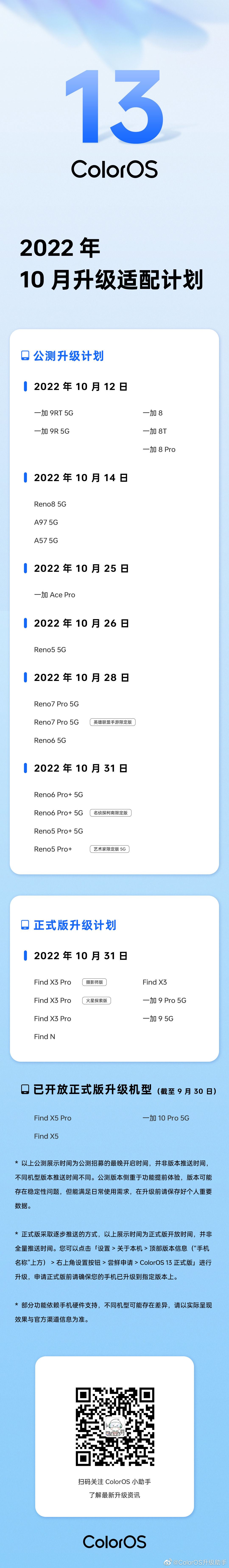 9 月 29 日消息,ColorOS 官方现已公布 2022 年 10 月的 ColorOS 13 升级适配计划。