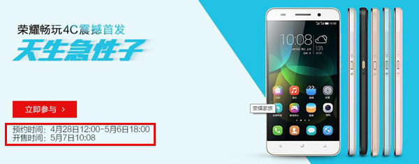 关于上市时间方面,荣耀畅玩4C已于4月28日12:00(也就是今天中午12点)-5月6日18:00期间在华为商城,京东商城以及华为天猫旗舰店进行预约预售,将于5月7日上午10:08正式发售,因此,确切的说,荣耀畅玩4C将于5月7日正式上市。