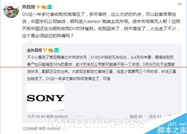 还记得几天前,分析师孙昌旭表示索尼摄像头传感器奇缺,五月份很多国产手机的后摄像头都会断货的事情吗?今天她再次进行了强调。