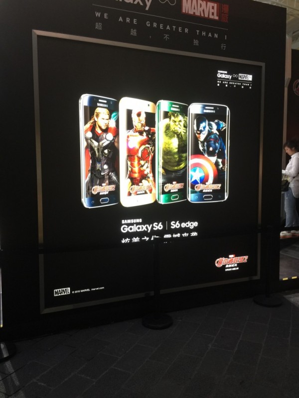 昨天5月12日,也就是复仇者联盟2首映的日子,我们来到位于上海新天地的影院来看看其热闹程度。在电影院的楼下就碰到了与复联合作的三星Galaxy S6和S6edge系列展台。展示着一系列复仇者联盟版的S6和S6edge以及配合这两个产品的虚拟现实设备。不过这次展示的复仇者联盟系列并非之前网传的采用全新配色的系列。
