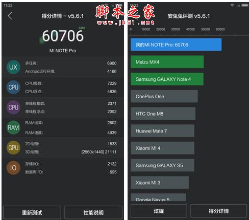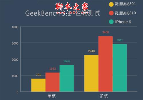 另外在和苹果A8的性能对比中也可以看到,高通骁龙810并不输于iPhone 6,在跨平台跑分软件GeekBench3.1上,高通骁龙810拿到了单核1163分和多核3400分的成绩,(高通芯片降频厉害,取初次分值),而A8则是单核1626分,多核2921分。所以也可以看到三者的大体排列,高通骁龙810相比于骁龙801提升明显,而在和苹果A8处理器的对比中,虽然高通骁龙810的单核性能上不及A8,但考虑到安卓的使用环境,所以多核运行下的轻松取胜似乎更贴近实际场景。