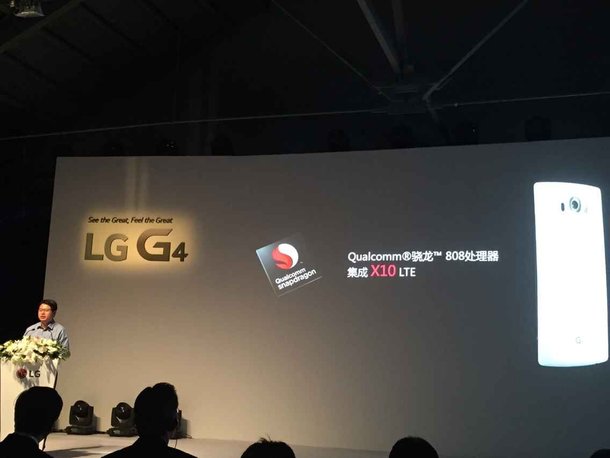 LG G4搭载高通骁龙808六核处理器(2×A57+4×A53),集成GPU Adreno 418,正面配备5.5吋2K屏幕,加入Quantum Dot显示技术,采用In-Cell Touch触摸技术,内置3GB运存和32GB机身存储,最大支持128G TF卡扩展。