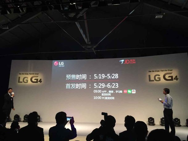 2015年5月19日,LG G4在海外发布会之后如期登陆中国,并在北京召开了新品发布会。这款手机于5月19日发布当天开始在京东商城预售,售价为3999元,并在5月29日正式抢购!