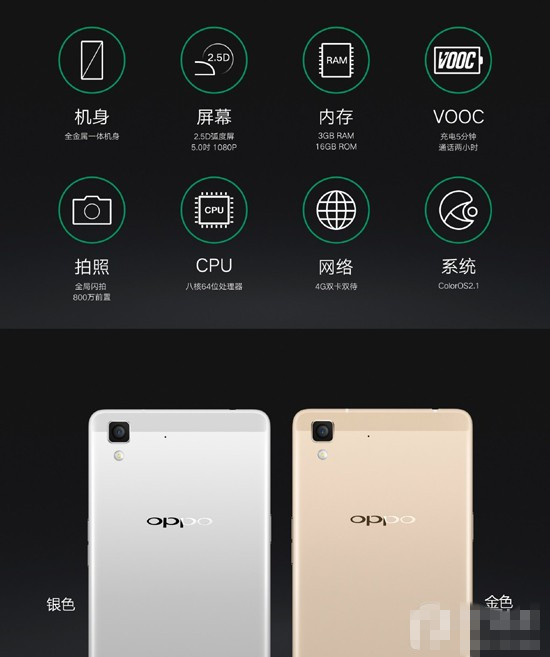 OPPO R7拥有全金属一体机身、2.5D弧度屏、3GB 运行内存、4种特色拍照和充电5分钟通话2小时的VOOC闪充!同时,它还有银色和金色两个版本。售价2499元,将于明日上午在京东商城上市开卖,而线下则会在这个月底全面铺货。