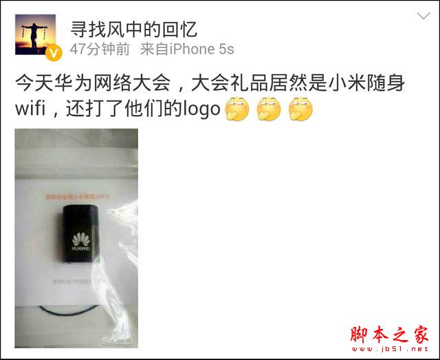 原博所附的图片显示,礼品本身的确是小米随身WiFi,只不过前面喷印了华为的LOGO。为什么以模仿著称的华为以及旗下荣耀对这个小东西倒懒得做了呢?为什么不采购360、百度、猎豹的产品呢?面对这对相爱相杀的伙伴,我不禁陷入了深深的沉思……