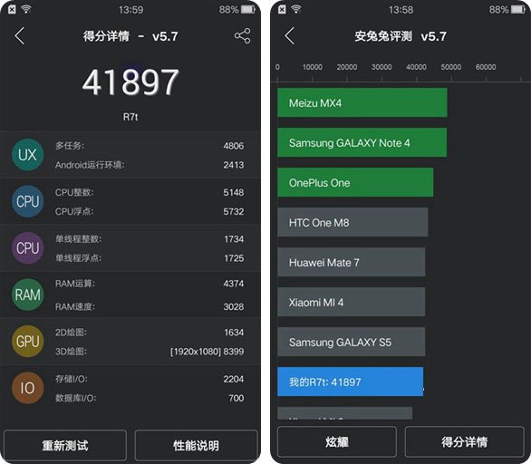 从上面安兔兔跑分来看,OPPO R7安兔兔跑分成绩为41897分,超过了4万分,从系统整体的跑分结果可以看出,整机的性能表现还是值得肯定的,40000+的成绩已经足以和上代旗舰手机相媲美。