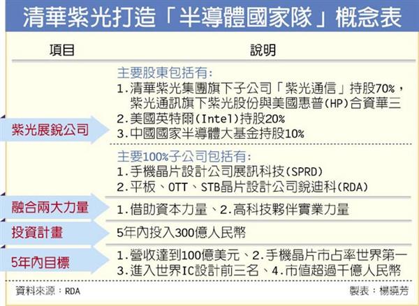 据台湾媒体中时电子报报道,中国清华紫光集团通过旗下IC设计公司锐迪科(RDA)最新召开物联网晶片发表会,内部提出“新的半导体国家队”5年计划,目标拿下全球手机芯片市场占有率第一。