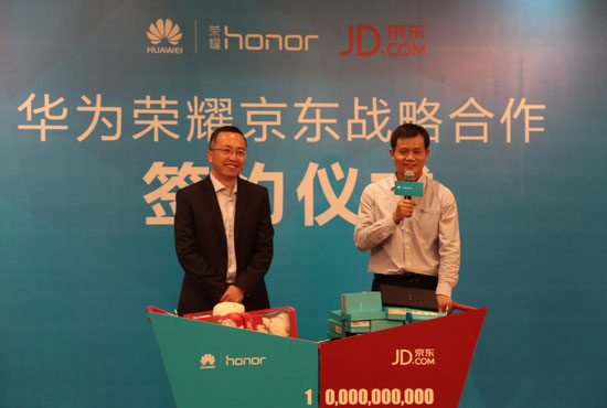 数据显示,2015年1-4月,在京东平台上荣耀手机连续蝉联销量第一的位置。对荣耀来说,百亿元的采购协议将助力完成荣耀在2015年度50亿美元的销售目标。