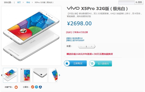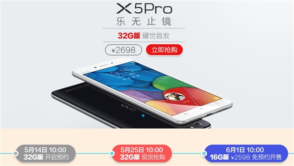 目前,X5Pro白色32GB版本在官网的售价是2698元,可以现货购买。而从6月1日开始,16GB版本也将免预约发售,价格是2598元。