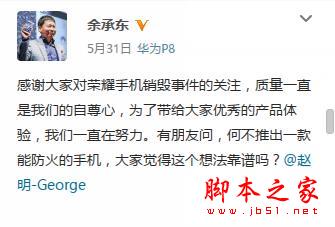 昨日,华为副总裁余承东发微博称“感谢大家对荣耀手机销毁事件的关注,质量一直是我们的自尊心,为了带给大家优秀的产品体验,我们一直在努力。有朋友问,何不推出一款能防火的手机,大家觉得这个想法靠谱吗?”
