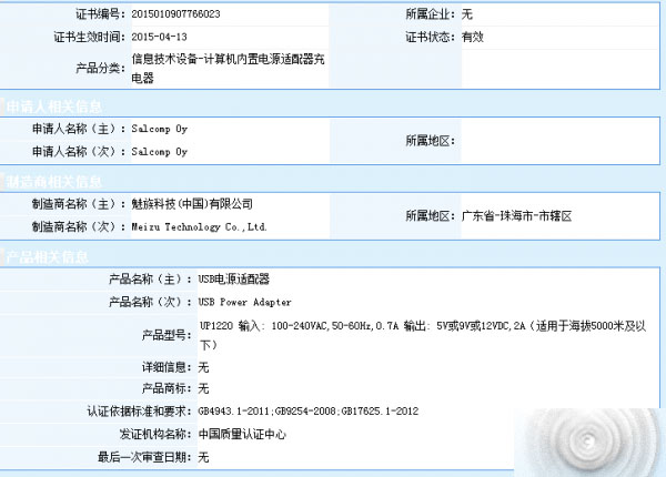 从CCC产品认证公众服务平台查询结果得知,魅族MX5将标配的充电器型号为UP1220,魅族以自己公司名义申请的CCC认证,根据以往的资料显示充电器都交给了赛尔康、正崴精密代工,这次也不例外,毕竟魅族自己只负责设计,生产早已外包。目前得知的参数,输入支持100-240V全球宽幅电压; 输出共有三档,分别是5V、9V、12V,都是2A,输出功率高达24W;比起小米Note(12W)、三星Galaxy S6(15.03W)标配的快充,更给力。