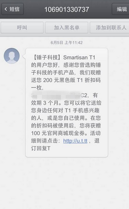 信息显示:Smartisan T1的用户您好,感谢您曾选购锤子科技的产品,我们现赠送您200元黑色版T1折扣码一枚,xxx,有效期三个月。