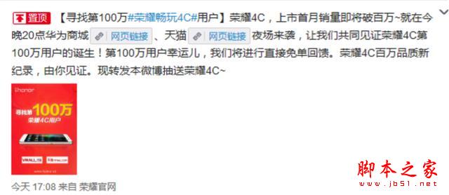 今天下午,荣耀官微发出来一条微博,大意是“寻找荣耀4C第100万个用户”,并引来热议。这款手机不是刚发售一个月吗?一个月销量100万台?在惊诧于其销量的同时,荣耀4c不失为荣耀2015年实现50亿美金的一个重要杀手锏。