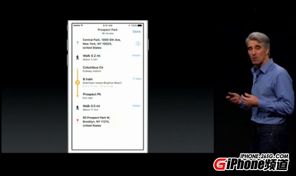 苹果地图中加入了公交换成等功能,可以选择地铁、公交、步行等多种出行方式,并且特别强调了这个功能在中国也可以使用。
