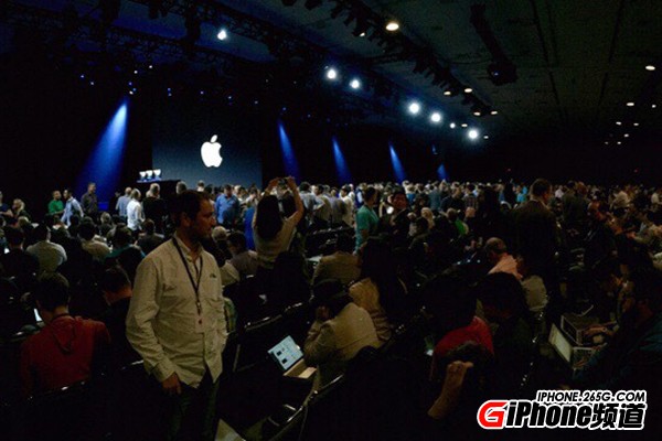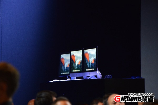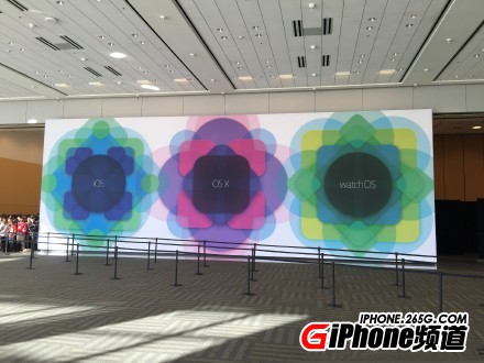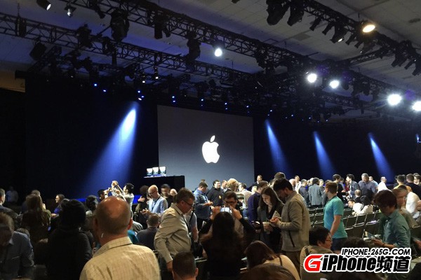 前方主席台上摆着三台iMAC,或许代表着今天将要发布的iOS9、OS X、Watch OS。