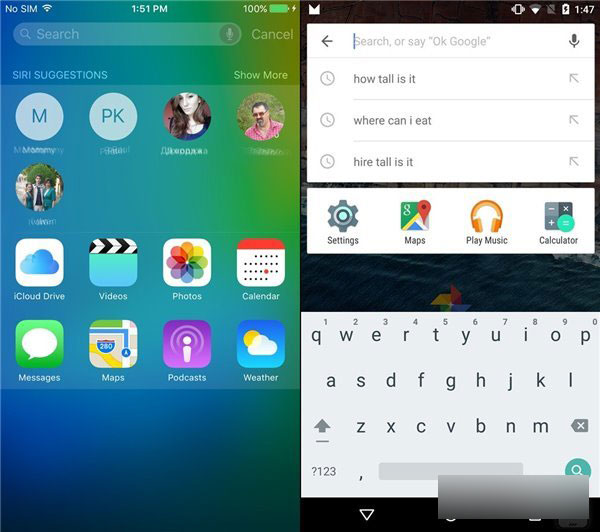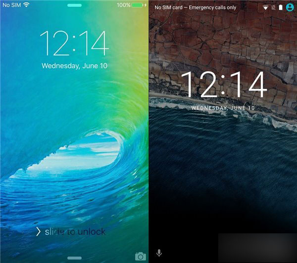 锁屏界面:安卓5.0取消了之前锁屏界面上的拨号快捷图标,原位置现在被“语音搜索”所取代。iOS9上,苹果也将把更加积极主动的新Siri图标搬到锁屏界面上。