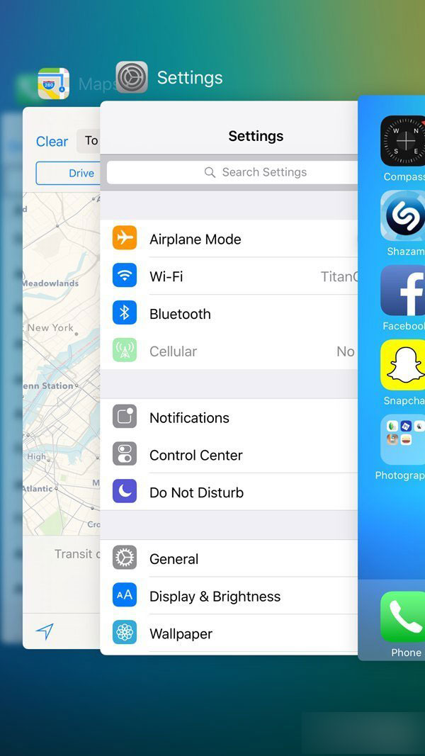 任务切换:iOS9也换上了全新的任务切换页面,原本处于上方的一行最近联系人被直接删除,卡片本身变得更大,滚动速度也明显更快,默认主屏幕位置也移动到了屏幕右侧。