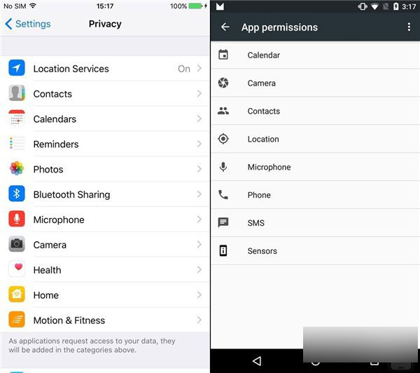 权限管理:安卓5.0自带了权限管理功能,可以通过按权限分类或按应用分类两种方式集中管理权限,而苹果则是更倾向于在应用首次运行时给出用户选择,当然,也可以通过隐私设置进行集中管理。