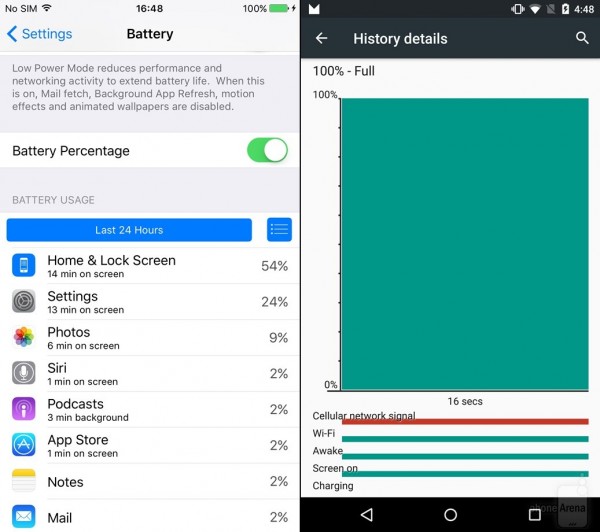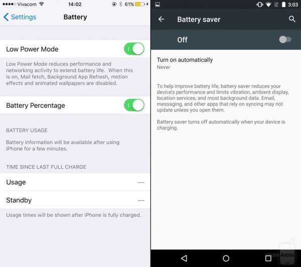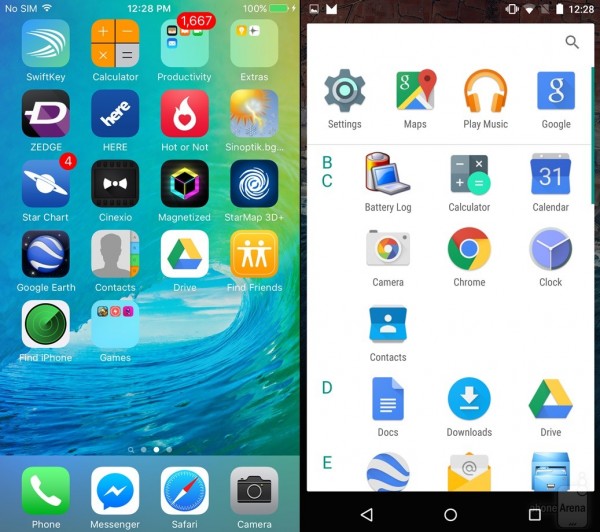 作为iOS 9, Beta,右为Android M开发者预览版(下同)。