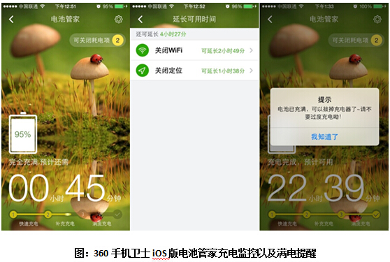 目前果粉可通过360手机卫士保护充电中的手机。360手机卫士的电池管家可对手机实现不间断监控,同时还可提示手机所处的充电状态:快速充电、补充充电、涓流充电三种方式,有效保护手机在充电时进行合理充放电。最关键的是,在充电完成,360手机卫士还会进行充满电提示,以保护手机不会因过度充电而耗损电池,延长电池使用寿命。